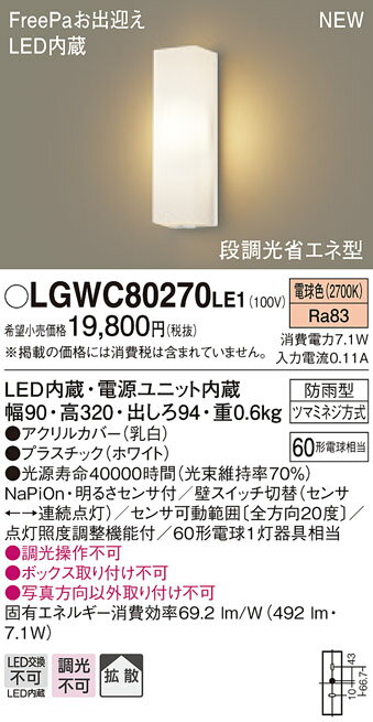 商 品 詳 細商品名パナソニック エクステリアライトメーカー名パナソニック Panasonicメーカー器具名称エクステリアライト ブラケットライト ポーチライト(玄関廻り)仕様◆LED(電球色タイプ) ◆光源色温度:2700 K ◆光源寿命40000時間(光束維持率70%)◆幅:90 mm ◆高:320 mm ◆出しろ:94 mm◆質量:0.6 kg◆器具光束:492 lm ◆電圧:100 V ◆消費電力:7.1 W ◆消費効率:69.2 lm/W◆デザイン分類:Casual◆【アクリルカバー】乳白◆【プラスチック】ホワイト◆Ra83◆NaPiOn・明るさセンサ付◆壁スイッチ切替(センサ←→連続点灯)◆センサ可動範囲〔全方向20度〕◆点灯照度調整機能付◆60形電球1灯器具相当◆入力電流(100V時):0.11 A◆調光操作不可◆ボックス取り付け不可◆写真方向以外取り付け不可注意事項◆写真方向以外取り付け不可 ※施工・電気工事は専門業者にご依頼ください。